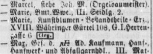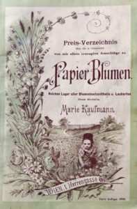 Ja, ihr seht richtig, die Lebensdaten von Marie Kaufmann konnte ich im Netz nicht ermitteln, immerhin fand ich den nebenstehenden Eintrag über sie im Wiener Adressverzeichnis für das Jahr 1898 und vor allem besitze ich ein Büchlein von ihr: „Die Anfertigung von PapierBlumen“, das mindestens fünf Auflagen erreicht hat. Deshalb wollte ich mehr über sie wissen.