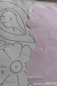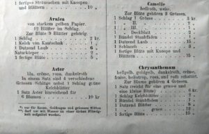 Der Untertitel der Veröffentlichung lautet übrigens „Neueste vollständigte Anleitung zum Selbstunterricht im Anfertigen von Papierblumen“ mit dem Hinweis „Niederlage aller Blumen-Bestandtheile“. Diese Bestandteile konnte man bei Marie Kaufmann bestellen, meinem Buch lag auch das „Preis-Verzeichnis über die in Oesterreich von mir allein erzeugten Ausschläge zu PapierBlumen“ bei mit dem Hinweis auf ein „Reiches Lager aller Blumenbestandtheile u. Laubarten“. Ich musste erst einmal recherchieren, für welche Währung die Abkürzung „fl“ steht, für das ungarische Forint, das damals dem österreichischen Gulden entsprach, wir reden ja von der Zeit des Kaiserreichs Österreich-Ungarn! Die Blumenbestandteile waren zwar für ein paar Kreuzer zu bekommen, die Cassetten, die man heute Sets nennen würde, kosteten aber zwischen 3,50 und 10 Forint/Gulden. Kurios finde ich in dem Heftchen die Mengenangabe „1 Schlag“, so ganz kann ich mir die Maßeinheit nicht erklären, bei der Arnica ist z. B. von 12 Blättern im Schlag die Rede, für die Chrysanthemen wird 1 Satz benötigt und 1 Schlag Kelchblätter. Zum Glück will und kann ich nichts bestellen, sondern nur versuchen, eine der Blumen zu basteln.