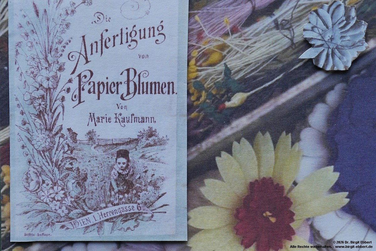 Es ist so schade, dass ich über die Frau keine weiteren Informationen entdecken konnte, je mehr ich mir die Anleitungen und das Preisverzeichnis angeschaut habe, umso neugieriger wurde ich. Falls also jemand aus Wien kommt und von ihr gehört hat oder eine Idee hat, wo ich mehr über sie erfahren könnte, schickt mir gerne eine E-Mail an info@vergessene-frauen.de Schon jetzt vielen Dank, ich besorge mir jetzt erst einmal Seidenpapier, um eine Blume auszuprobieren. Die Cassette© ihrer Materialien, die ich im Internet fand, ist leider bereits verkauft, allerdings wäre mir 190 € doch zu viel Geld gewesen. © 2025 Dr. Birgit Ebbert www.vergessene-frauen.de – www.birgit-ebbert.de